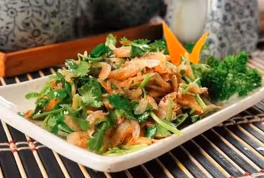 2,蝦皮去雜,用涼開水洗凈,放在香菜上,加醬油、味精、香油,拌勻即成。