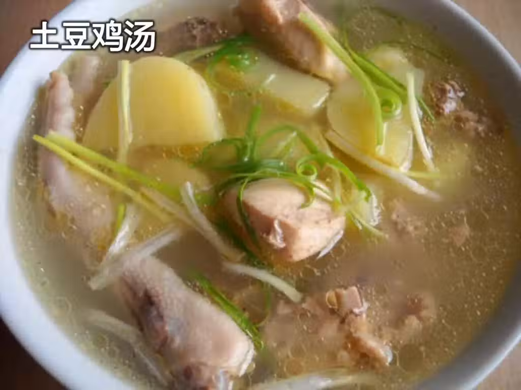 材料:三黃雞 1隻,土豆 3個,姜 1塊,大蔥 1段