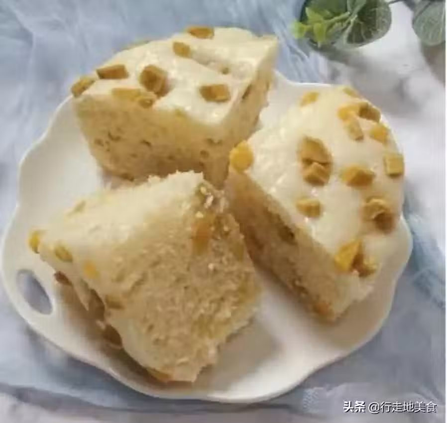 5.發酵好後,撒上紅薯丁,上鍋蒸30分鐘,冷卻脫模