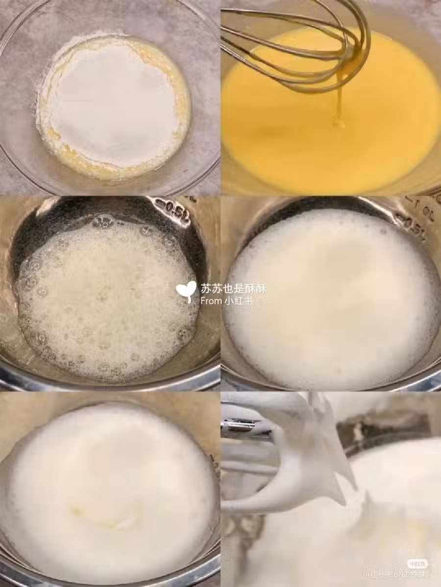 4. 先預熱好烤箱,將1/3的蛋白糊加入蛋黃糊裡,用刮刀以切拌的方式攪拌均勻。之後,再將蛋糕糊倒入剩餘的蛋黃糊裡,翻拌均勻即可。