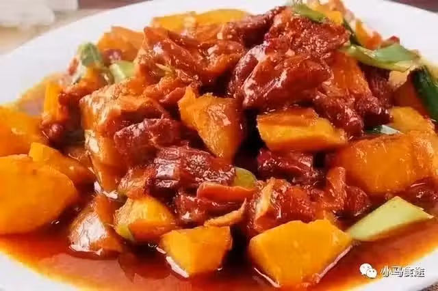 2.鍋置火上,下入牛肉,醬油炒之,加入蔥、姜、醬油,並加入水浸過肉塊,蓋上鍋蓋,用文火燉至肉快爛時,加入精鹽、馬鈴薯放入再燉,燉至肉、馬鈴薯酥爛而入味時即成。