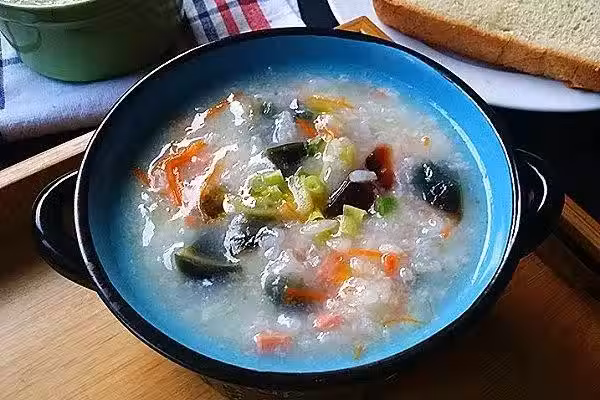 皮蛋2個.大米140克、火腿腸1根.胡蘿蔔20克.香蔥少許.薑絲少許、食鹽1勺、 亞麻籽油1湯匙