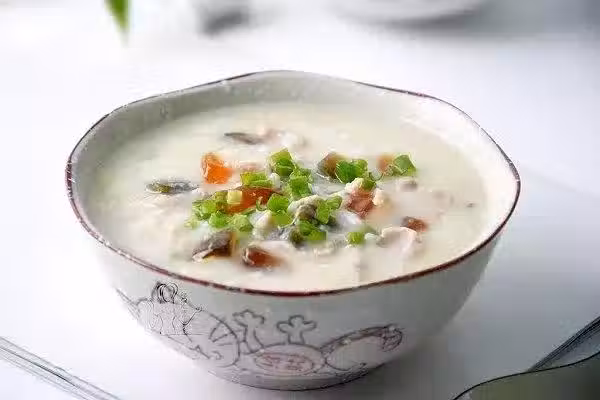 6. 加入皮蛋、瘦肉、薑絲,煮一會肉絲熟了,最後加鹽、香油調味,根據需要加蔥花。