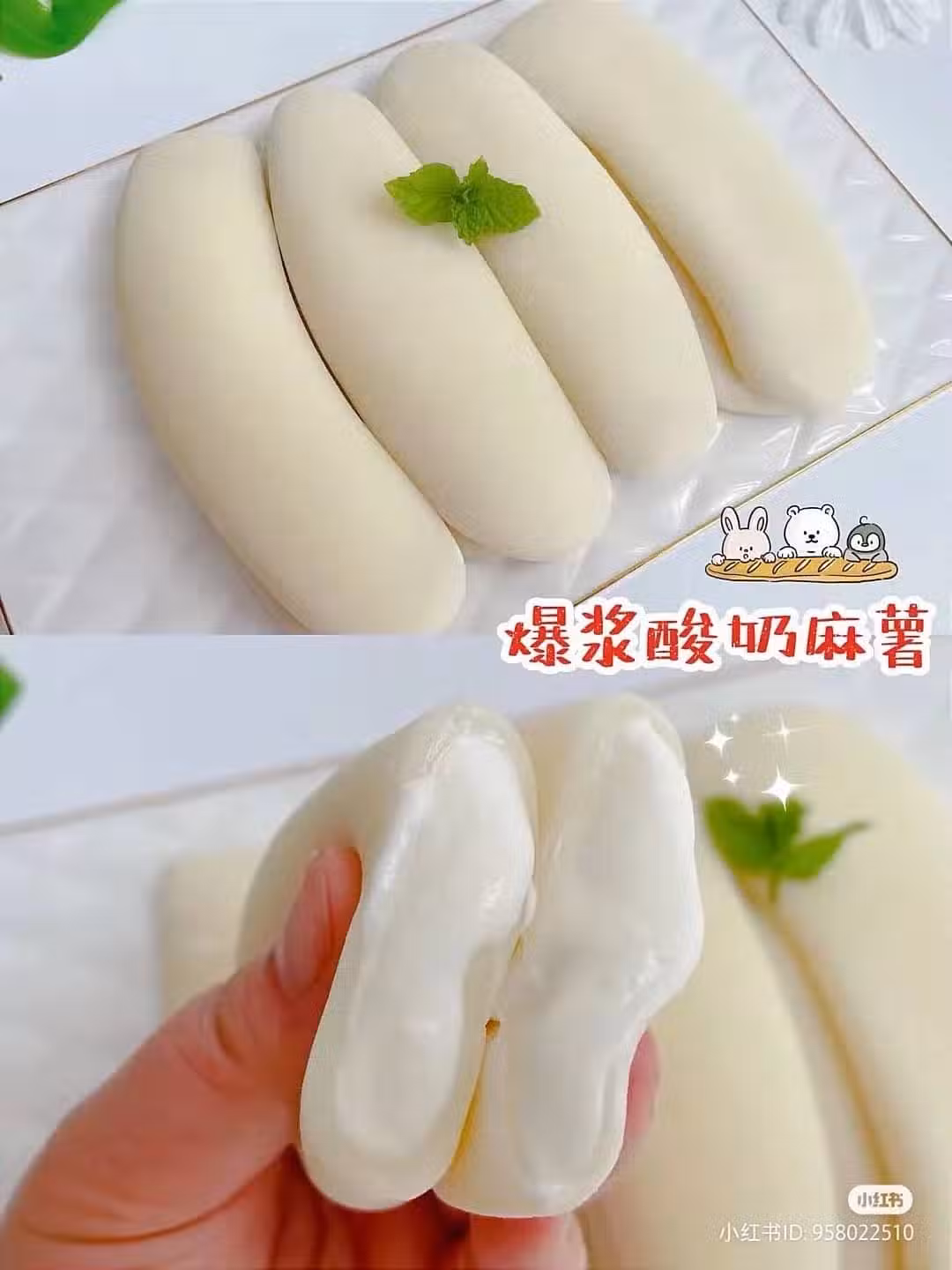 3]分成10等份,撒一層熟糯米粉,擀成橢圓形,劑上酸奶,收口捏緊即可!