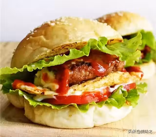 16、最後就是疊料啦,生菜,番茄,火腿片,沙拉醬,肉排,番茄醬,麵包依次疊加就可以啦。