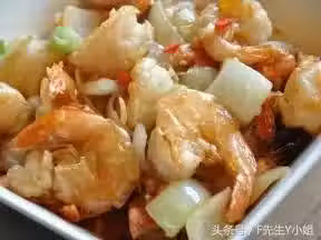 3,鍋中再放油,燒熱後放入洋蔥爆出香味,加少許鹽,然後放入蝦翻炒
