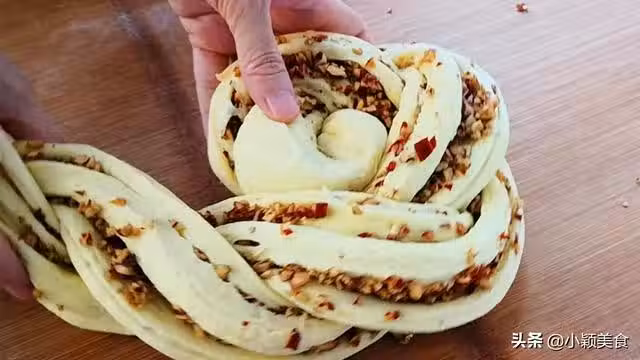 12.再從一頭捲起,尾部放到下面,這樣,我們的饅頭生坯就做好了。