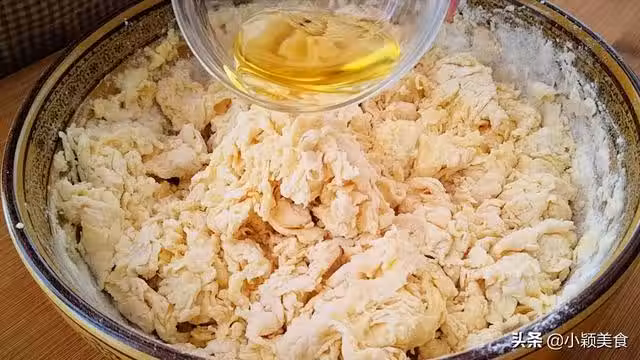 3. 攪拌至酵母粉融化後再分多次加入400克普通麵粉攪拌成絮狀,再加20克食用油
