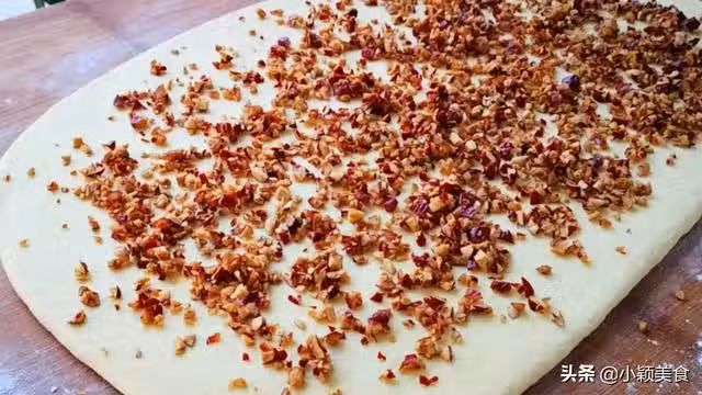 8.再將發好的麵糰揉搓排氣整理成圓形,再撒點乾麵粉防止粘黏,然後擀成長方形的大麵餅,不要太薄,半厘米左右厚就可以了,上面在撒上切好的紅棗碎。