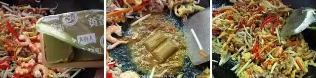 13. 倒入米粉,用剪刀剪斷太長的米粉,左右各持一雙筷子,挑散米粉及佐料,拌勻,米粉均勻沾上咖哩即可出鍋。