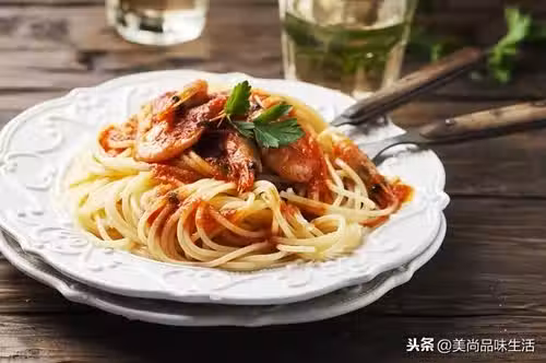 大蝦去頭去殼挑沙線,放少量的料酒、鹽、生粉抓捏入味,用黃油煎至兩面金黃成熟。熱鍋涼油,放入洋蔥碎、蒜末煸香,加入番茄丁翻炒片刻放,.倒入適番茄醬,加少量水的煮10分鐘,最後加適量的鹽、糖、澱粉水收汁。倒入煮好的意面上。煎好的蝦仁放在其上。