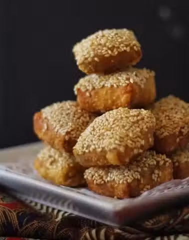 3 豆沙年糕塊沾上打好的蛋汁, 並將其中一面沾上芝麻,便放入已預熱的油鍋里炸。