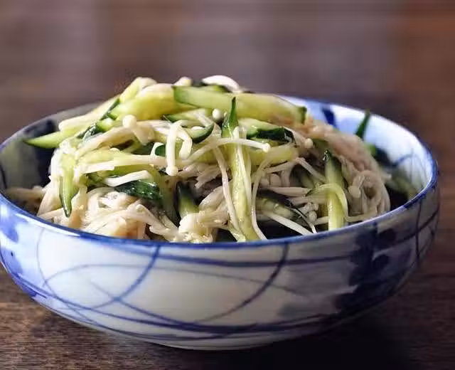 材料:金針菇、糖、雞精、鹽、白醋、香油、蒜末、黃瓜