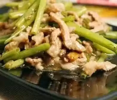 食材:空心菜梗,裡脊肉,蒜片少許,料酒,生粉,生抽,鹽,味精。