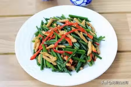 原料:豬裡脊肉400克,韭菜100克,植物油、精鹽、雞精、薑絲、料酒各適量。