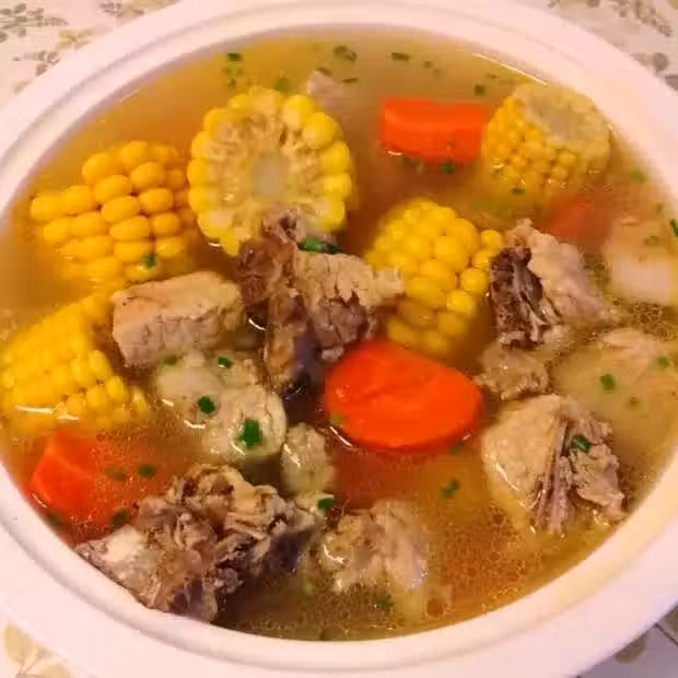 用料:排骨、玉米、胡蘿蔔、薑片、乾貝、食鹽、白醋、料酒