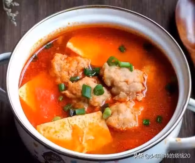 食材:番茄、豬肉、蔥姜蒜、豆腐、鹽、生抽、料酒、雞粉、胡椒粉、雞蛋