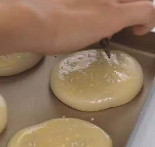 刷一層蛋黃,撒一些白芝麻,劃出割口。