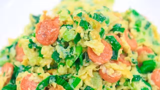 1、幾根洗乾淨的蒜苗,4個雞蛋和兩根火腿,蒜苗切成段,把梗和葉分別盛放在碗中,火腿切成片,雞蛋打入碗中,加入食鹽2克、雞精1克、胡椒粉1克去腥。食鹽不僅能入底味 還能使蛋清和蛋黃充分融合。蛋液中放入蒜苗葉拌勻備用。