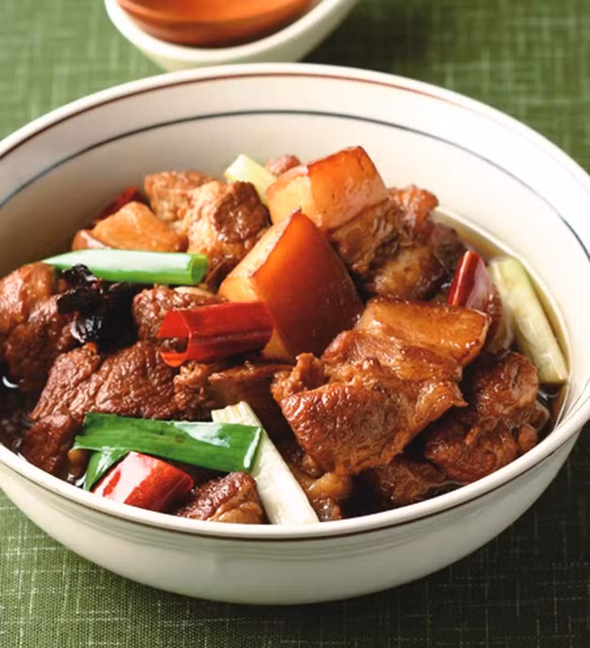 3 放入梅花肉塊炒至微焦,加入所有調味料炒香。