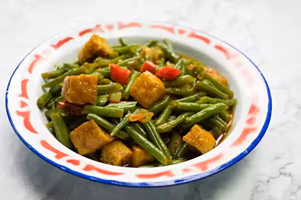 2、 將四季豆切段。豆腐切成3cm大小的方塊,備用。