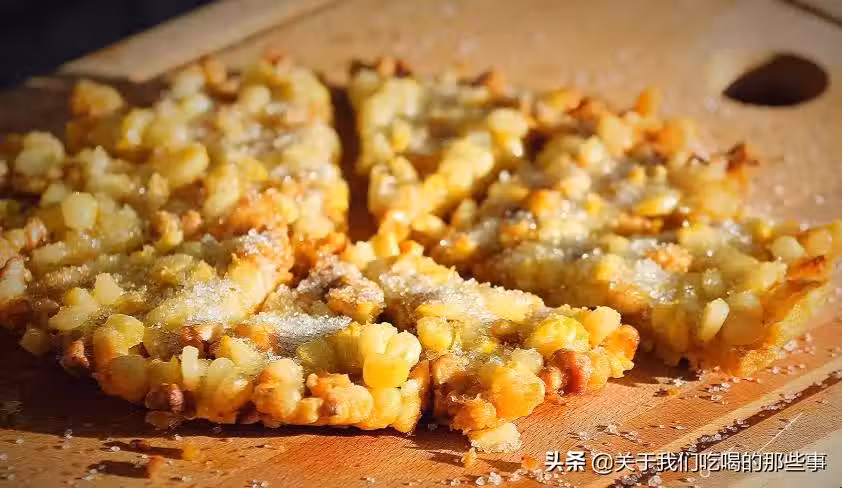 3、起鍋倒入少量油,燒熱後倒入核桃仁玉米粒,用鏟子壓平,小火煎2分鐘,煎至定型。再淋入適量油,煎至顏色金黃後出鍋,根據個人口味撒上白糖或食鹽,其實原味也非常好吃。