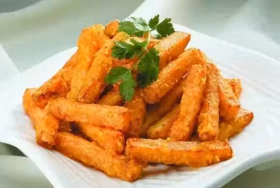 4.將炒鍋內的油燒至七成熱時將炸過的瓜條放入鍋中復炸,炸至金黃色撈出瀝油裝盤,撒上花椒鹽即可上桌供食。