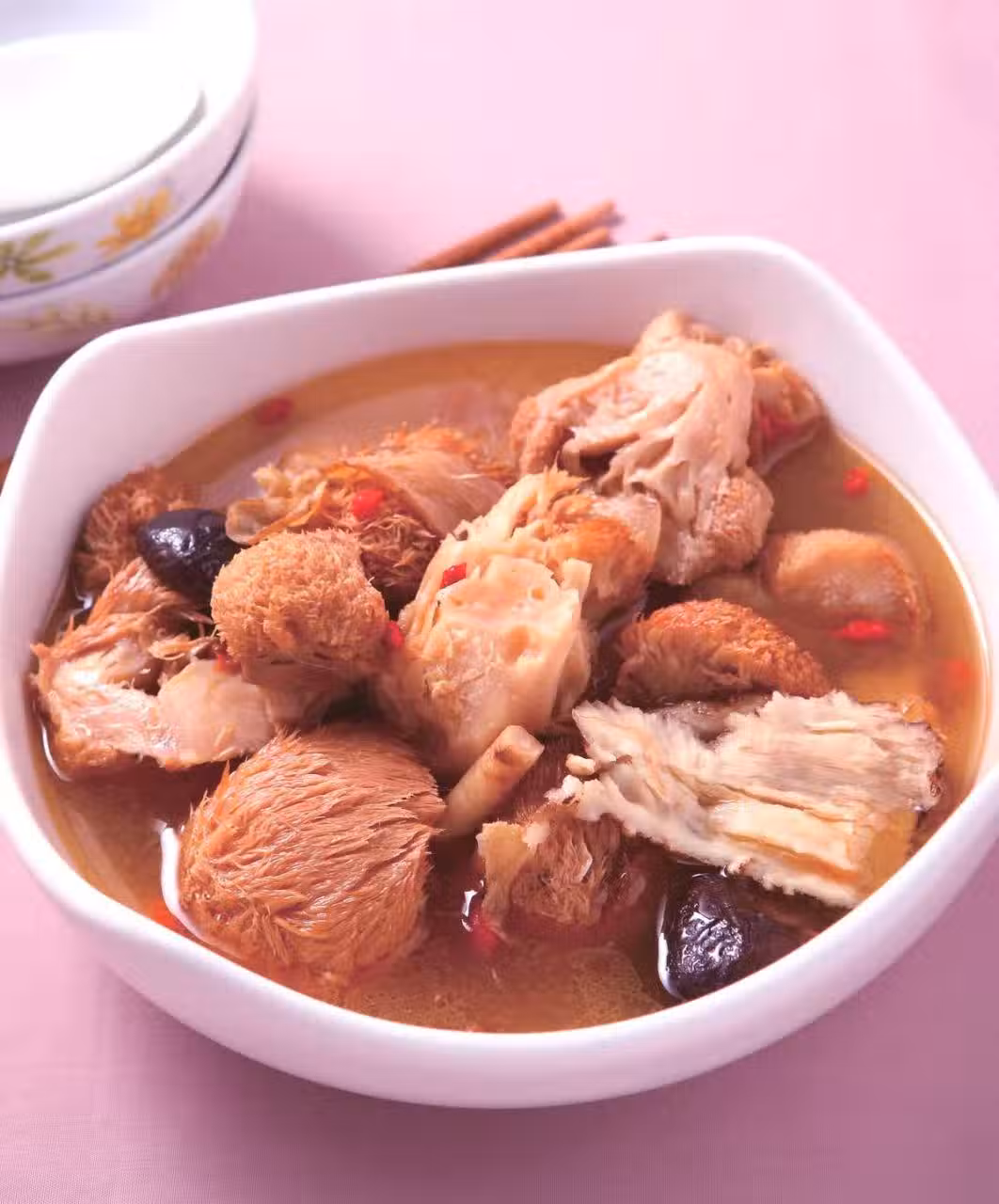 3 再加入猴頭菇、當歸、蔘鬚、紅棗、枸杞、素高湯及米酒煮開。
