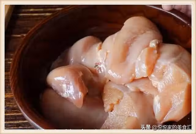 【第一步】:先把香蔥洗凈,切成段,老薑切片,放入大碗裡面加入溫開水,讓它泡出蔥薑汁水,雞胸肉清洗乾淨之後切成小塊,