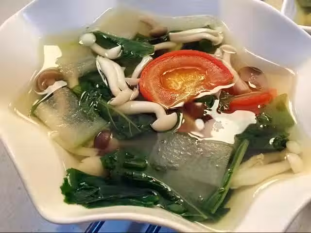 蔬菜湯的食材隨意搭配,想吃什麼就放什麼,但一定要有蘑菇
