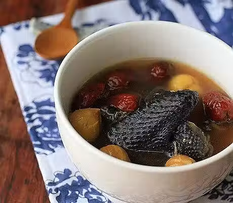 烏雞500克;栗子250克;紅棗少許;枸杞少許;姜5片;米酒少許;鹽適量