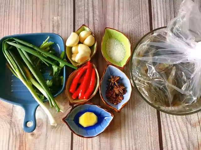 2、把配料放到一個大碗里,蒜米、紅米辣、花椒八角放在上面,一會要澆油激發出香味,入鹽1湯匙。
