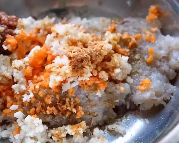 6.製作餃子皮:澄面和澱粉混合。一定要是開水,轉圈加入,一邊加一邊攪拌,讓麵粉充分融合加熱。 用手感覺一下,不燙手的情況下,馬上開始用手揉面,麵糰不能涼。