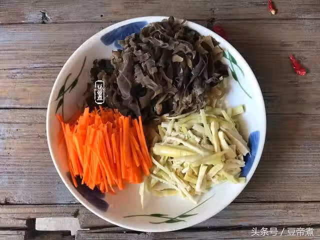 1、食材所需的筍絲根據您的愛好最好選擇酸筍絲。,把黑木耳及紅蘿蔔全部改刀切成絲備用。