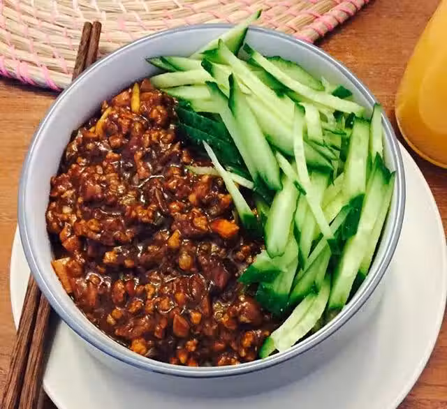 熬煮一會,加少許糖,可以嘗一下味道決定要不要再加糖,最後加入蔥花翻炒一會就可以關火了,煮麵條大家都會啊,過下涼水更加筋道,放上黃瓜絲還有美味的醬醬,簡直好吃的不要不要的。