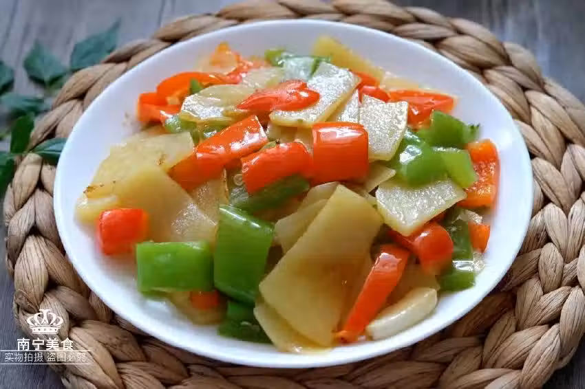 1、 把土豆去皮後切成片,紅甜椒洗乾淨後切成塊,青椒洗乾淨後切成塊待用