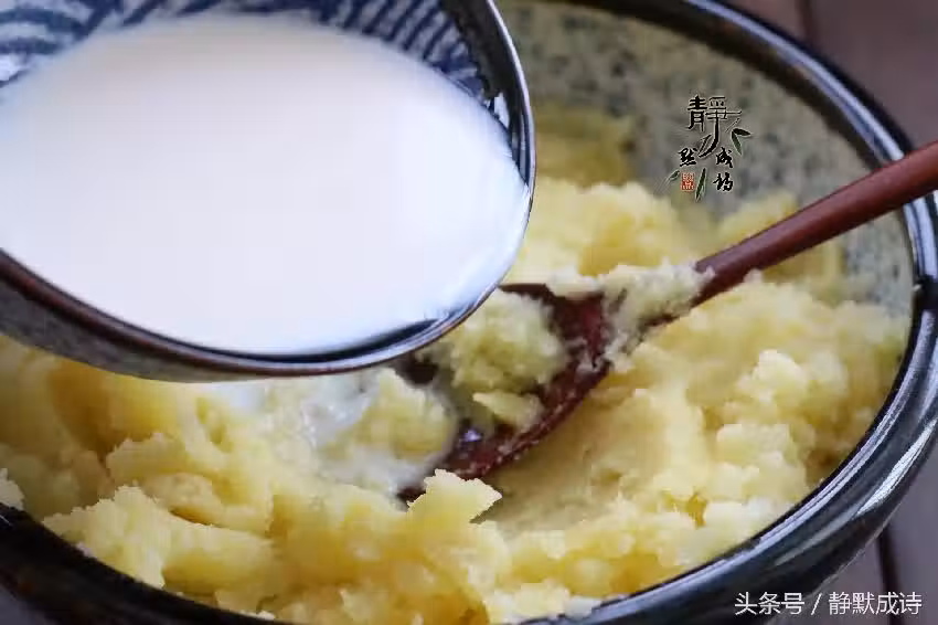 接著加入適量牛奶,邊加邊攪拌,不要一次加入,直到土豆泥變的潤滑即可。