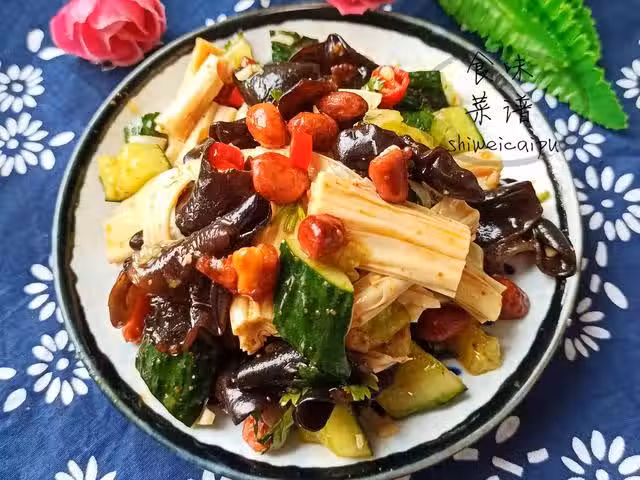 食材:腐竹、黑木耳、黃瓜、大蒜、花生米、香菜
