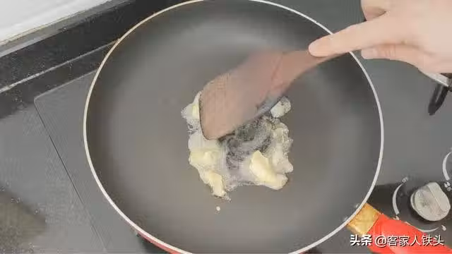 第三步:黃油煮化後,倒入300克的菠蘿,40克的白糖,調中火翻拌均勻後熬煮2分鐘,煮好倒入小半碗的水澱粉,把它煮至濃稠就可以出鍋了,盛到碗中備用。