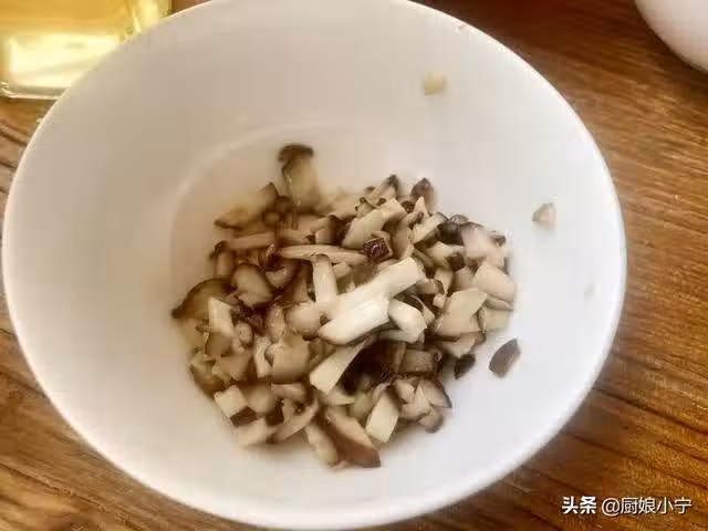 3,下面準備配菜,香菇切成小丁,放入油鍋翻炒一下,這樣做的香菇沒有土腥味。