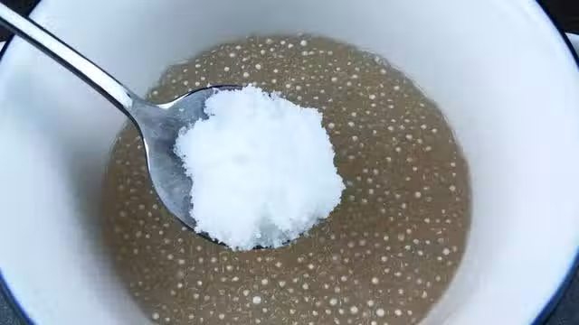 6. 鍋中加入400毫升的牛奶,加入30克的白涼粉,加入30克的白砂糖,攪拌均勻 大火煮開。