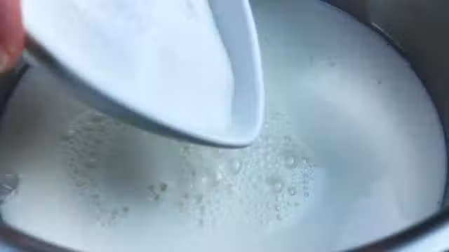 7. 再把煮開的牛奶果凍汁過濾到玻璃容器中,再用勺子撇去上面的浮沫。