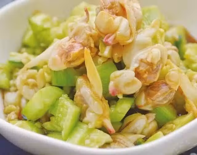 【材料】蛤蜊500克、黃瓜1根、姜15克、食鹽2克、白糖8克、醋10克、醬油15克、香油1勺