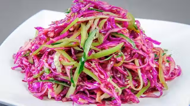 1、紫甘藍一個,切開後去掉根部切成細絲,越細越好入味。青椒去籽後切成細絲,放在盆里備用,黃瓜切成細絲和青椒絲放在一起。再搗點蒜泥。