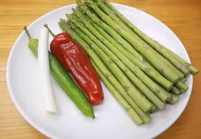 1.準備一把蘆筍,從中間切開,根莖的地方粗纖維比較多,用削皮刀刮一刮,吃著口感更好;切點蔥絲、青椒絲、紅椒絲放在一起,用清水泡上防止脫水。