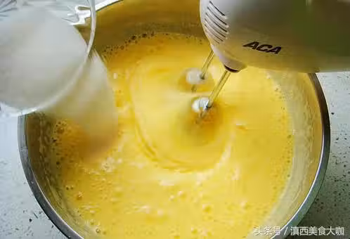 5 、打發一兩分鐘後倒入剩下的白砂糖,繼續打發。