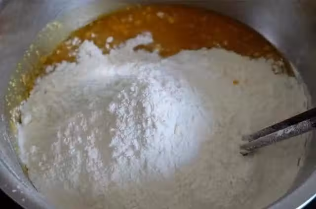 2、加入麵粉。麵粉的加入量根據南瓜汁的濃稠程度來決定。