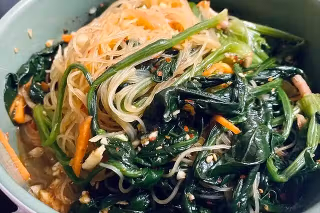 食材:菠菜、胡蘿蔔、粉絲、大蒜、花椒、熟芝麻、鹽、白糖、生抽、香醋、食用油