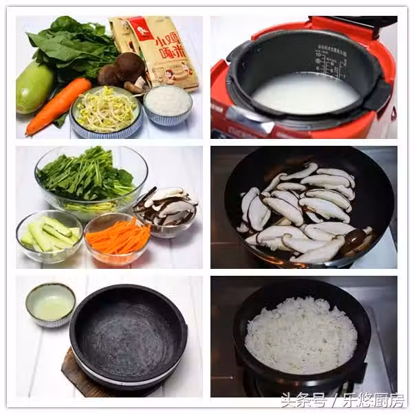 第六步:趁加熱米飯的時候,開始準備菜。鍋中倒入適量的食用油,油熱後,將香菇片放入鍋中煸炒2分鐘,出鍋前放入少許鹽調味。(用這個方法,依次把其他蔬菜放入鍋中炒熟就行。需要注意的是,像黃豆芽這種比較難成熟的,要多炒一會兒。)