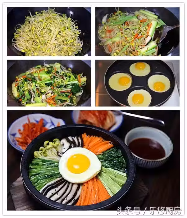 第十一步:將煎好的雞蛋放在蔬菜上,即可上桌開動了。吃的時候,拌上韓式辣醬即可。(一般超市裡買的韓式辣醬比較黏稠,大家可以鮮梨汁或者雪碧稀釋一下,這樣不僅味道好,也更容易攪拌。)